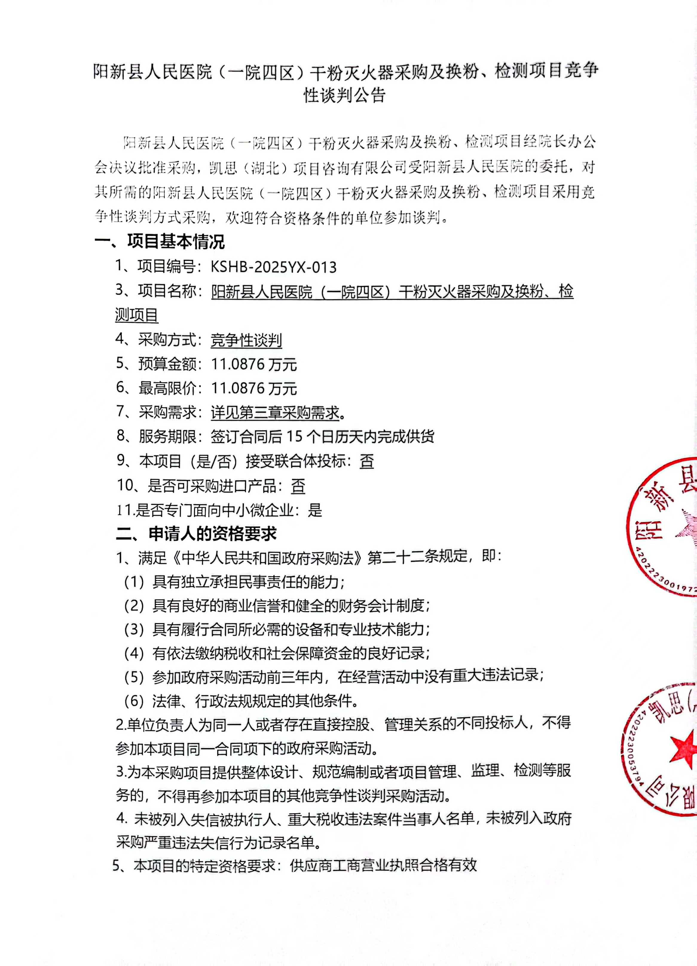 《阳新县人民医院(一院四区)干粉灭火器采购及换粉、检测项目竞争性谈判公告》
