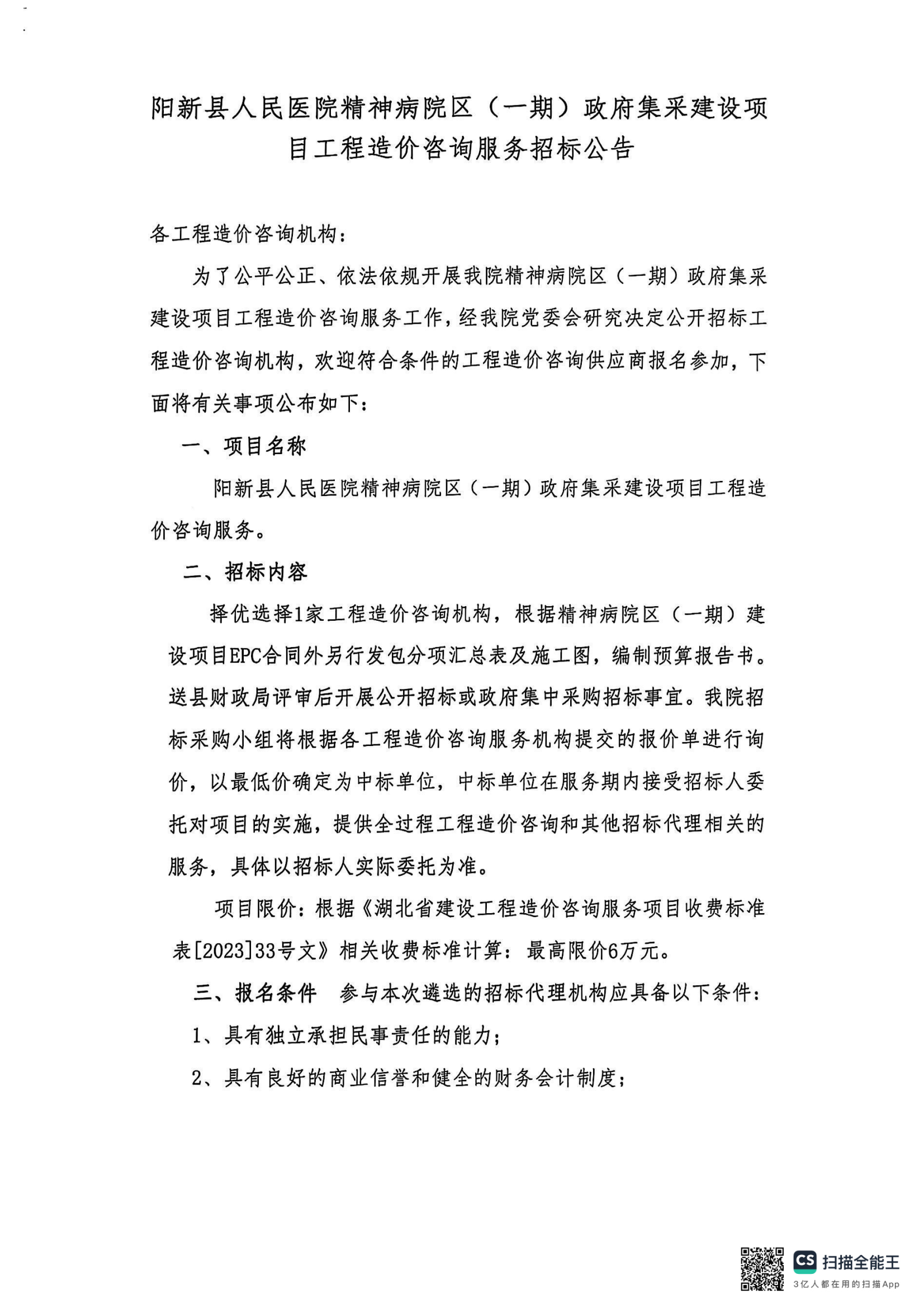 《阳新县人民医院精神病院区(一期)政府集采建设项目工程造价咨询服务招标公告》