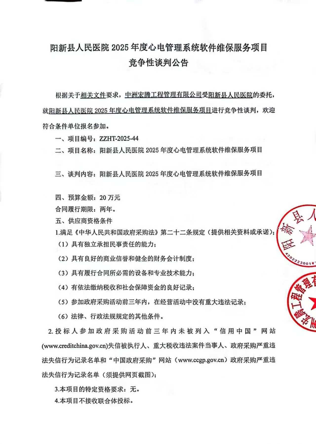 《阳新县人民医院 2025年度心电管理系统软件维保服务项目竞争性谈判公告》