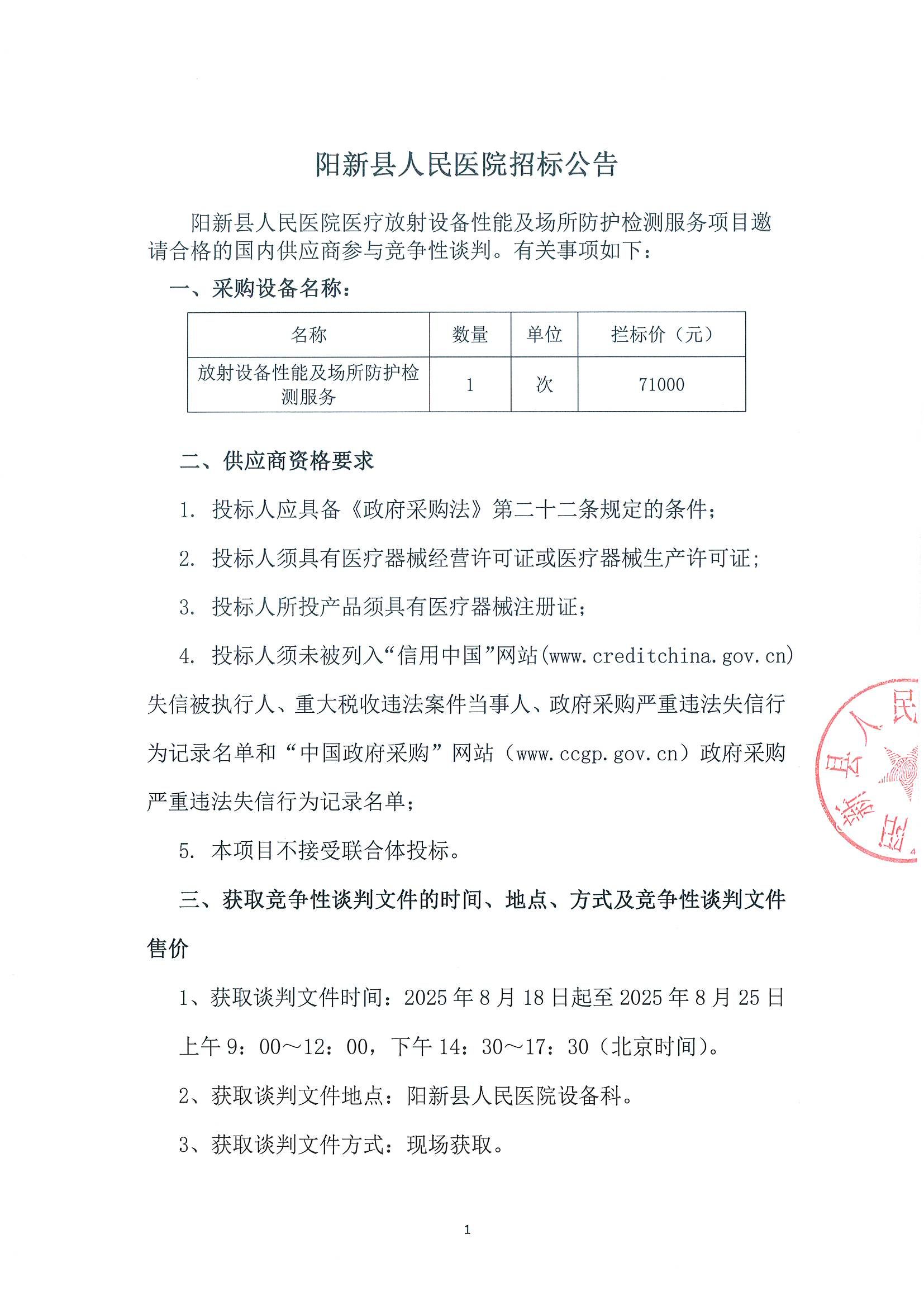 《阳新县人民医院放射设备性能及场所防护检测服务项目招标公告》