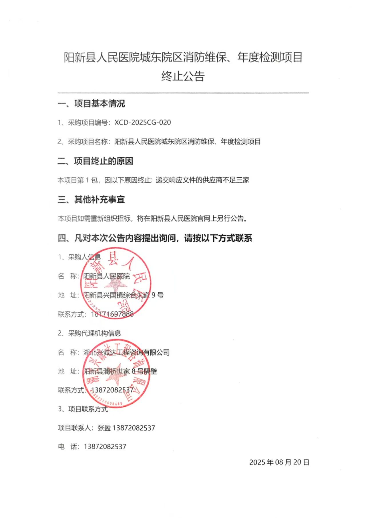 《阳新县人民医院城东院区消防维保、年度检测项目终止公告》