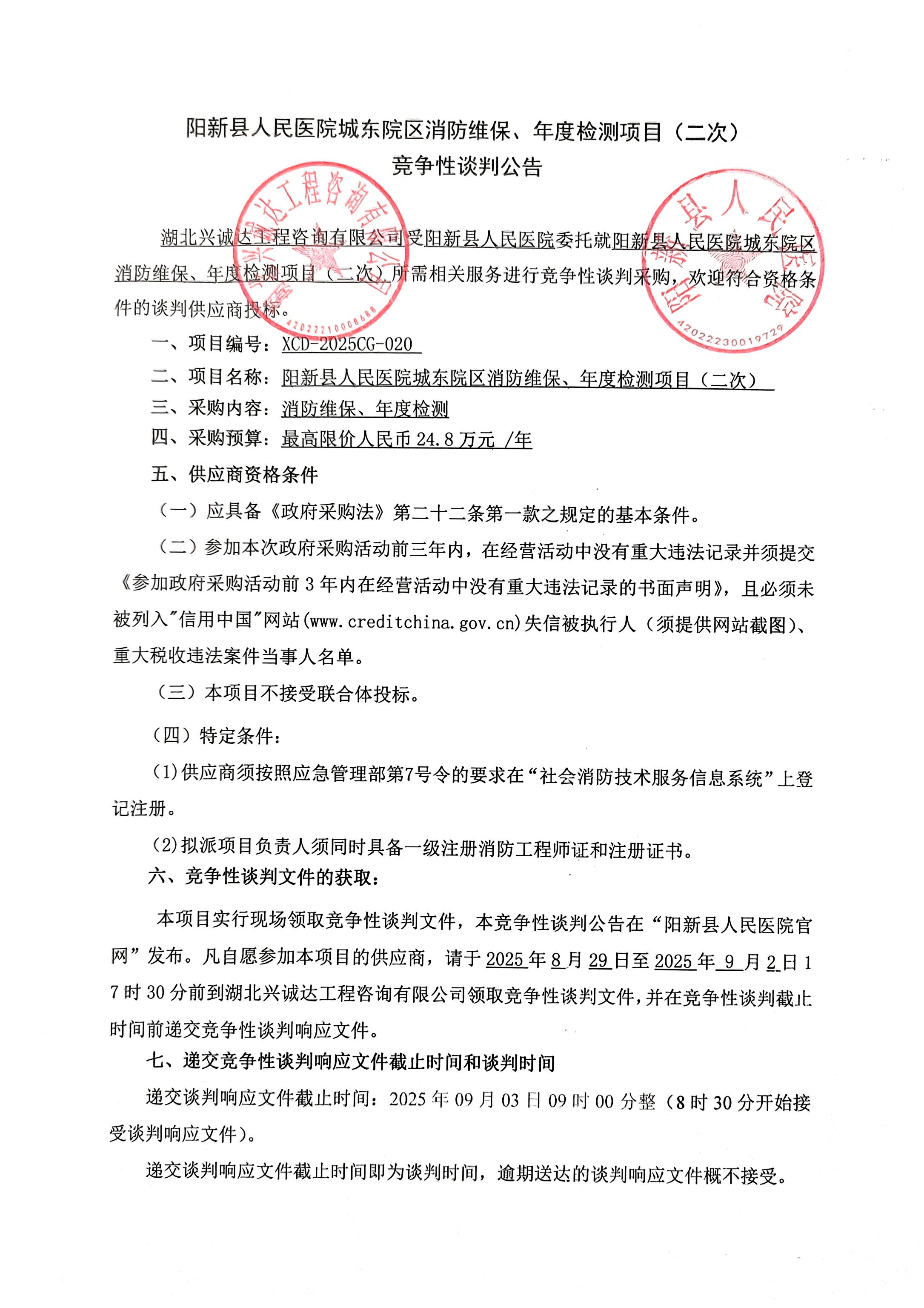 《阳新县人民医院城东院区消防维保、年度检测项目(二次)竞争性谈判公告》