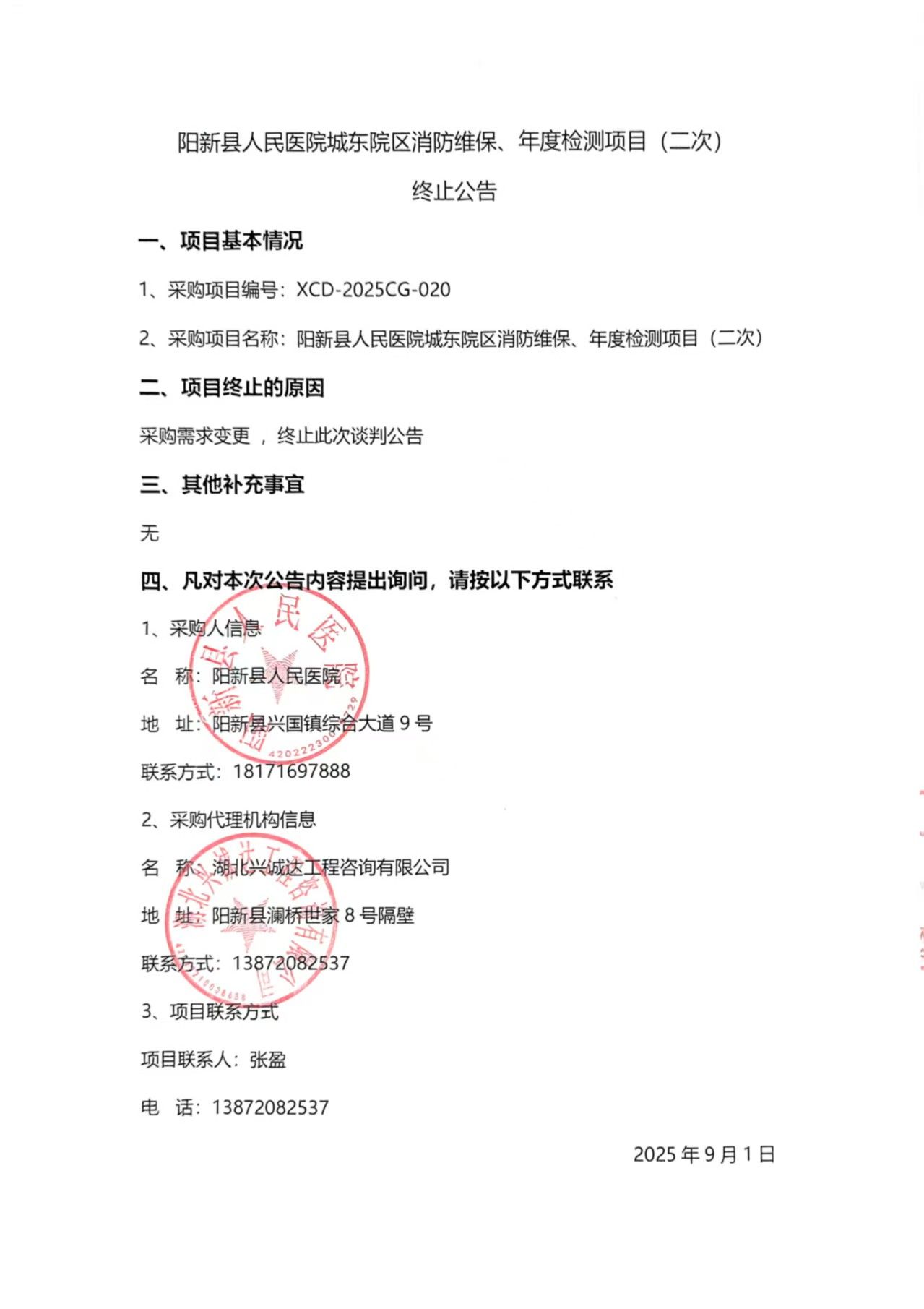 《阳新县人民医院城东院区消防维保、年度检测项目(二次)终止公告》