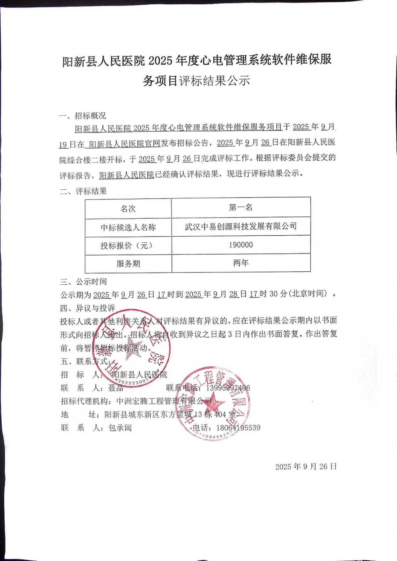 《阳新县人民医院 2025 年度心电管理系统软件维保服务项目评标结果公示》