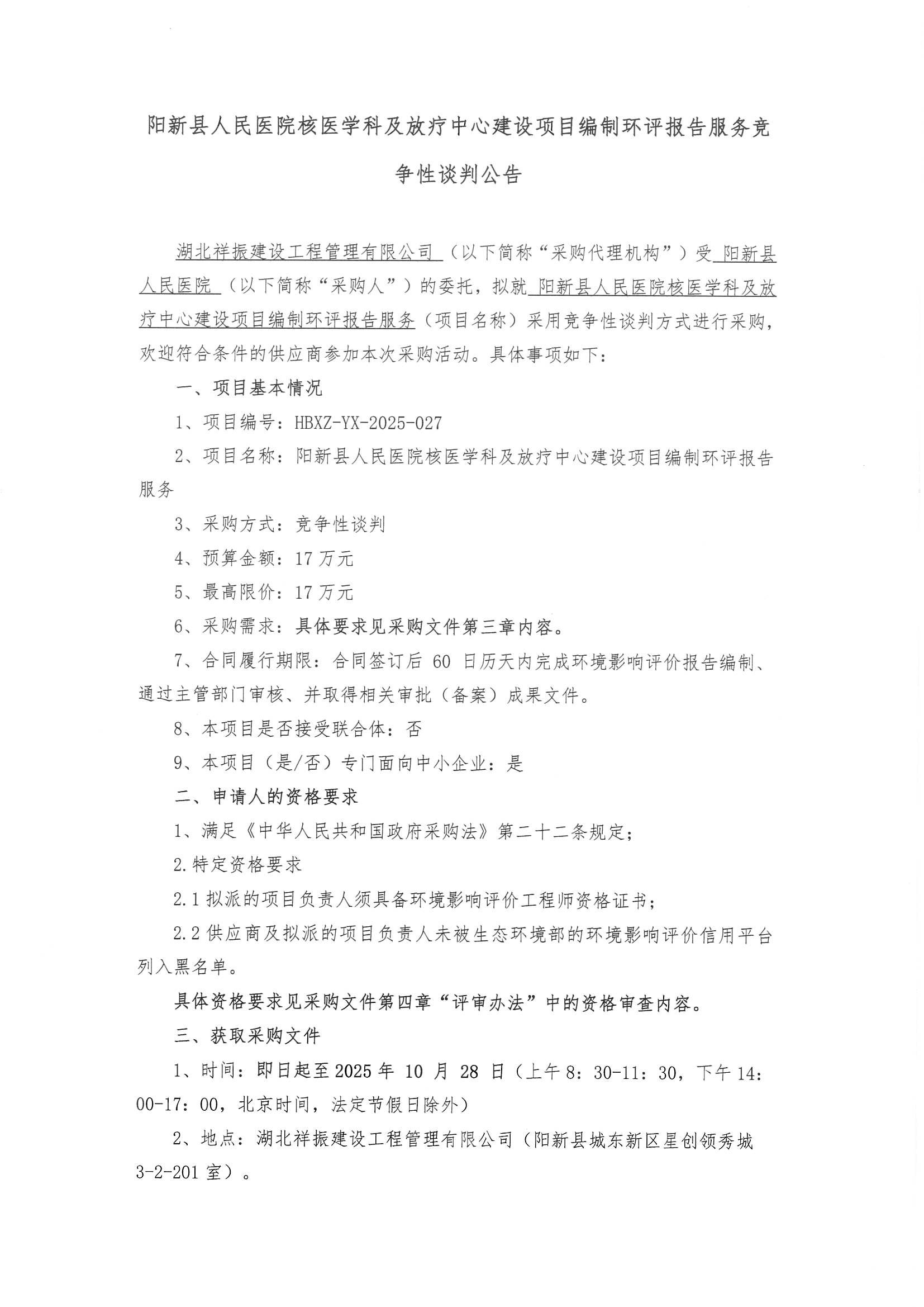 《阳新县人民医院核医学科及放疗中心建设项目编制环评报告服务竞争性谈判公告》