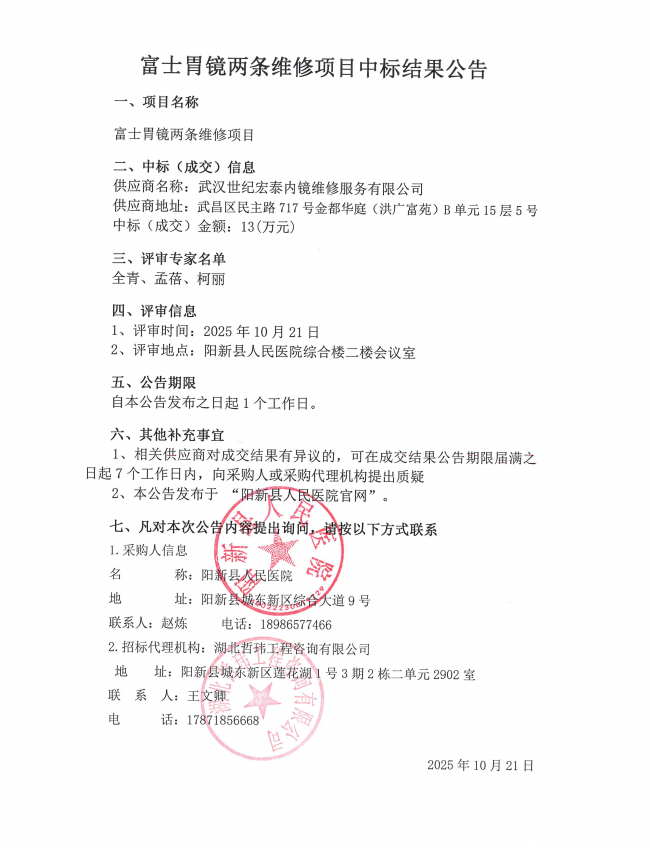 《富士胃镜两条维修项目中标结果公告》