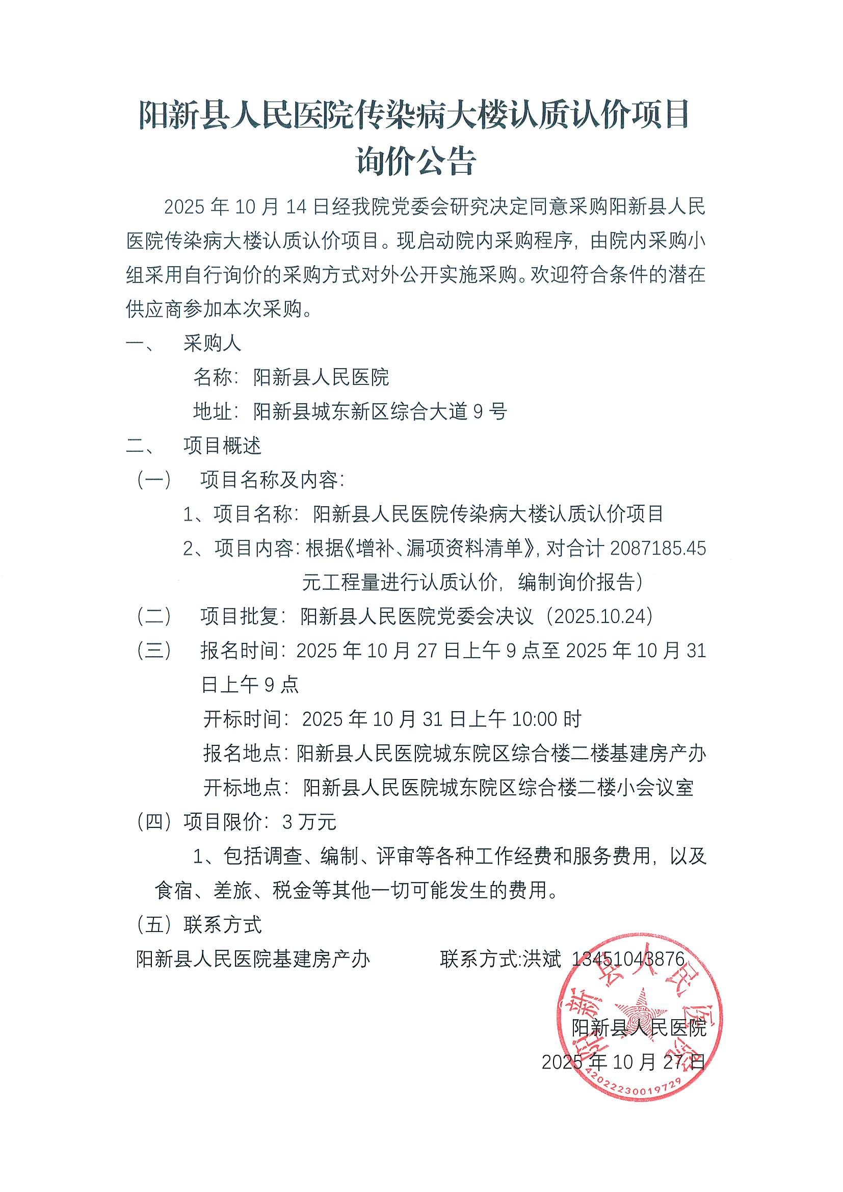 《阳新县人民医院传染病大楼认质认价项目询价公告》