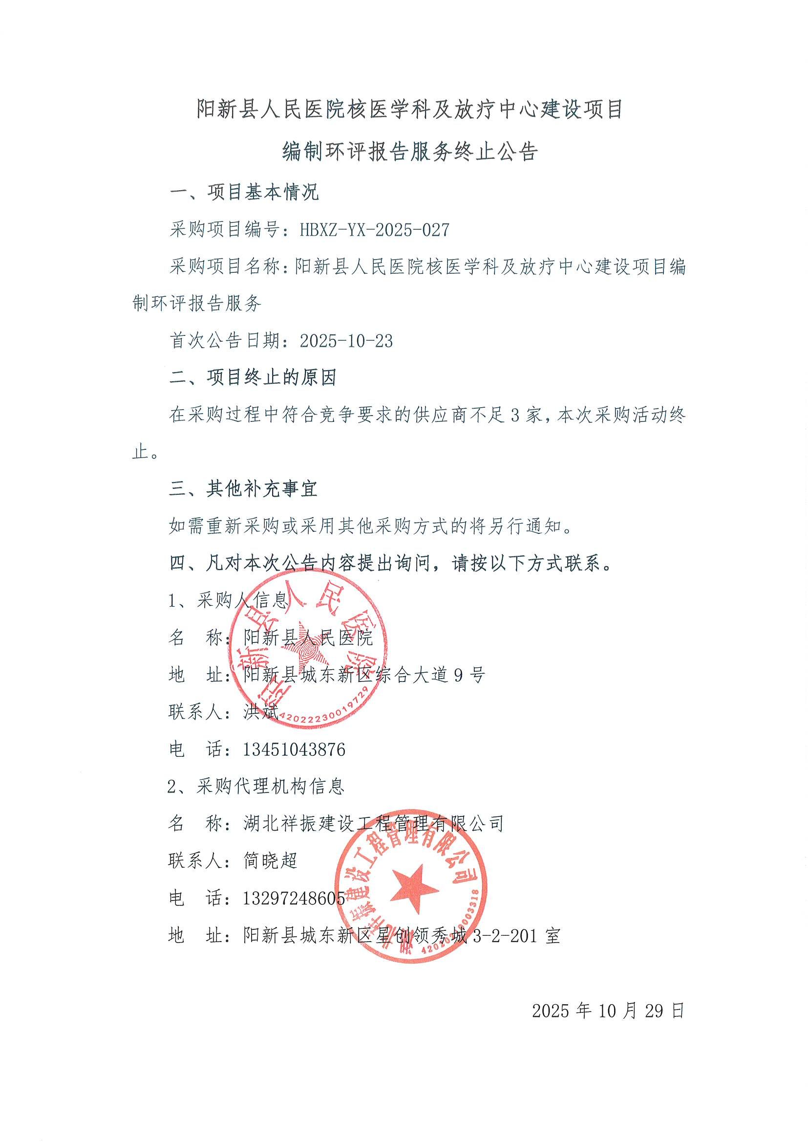 《阳新县人民医院核医学科及放疗中心建设项目编制环评报告服务终止公告》