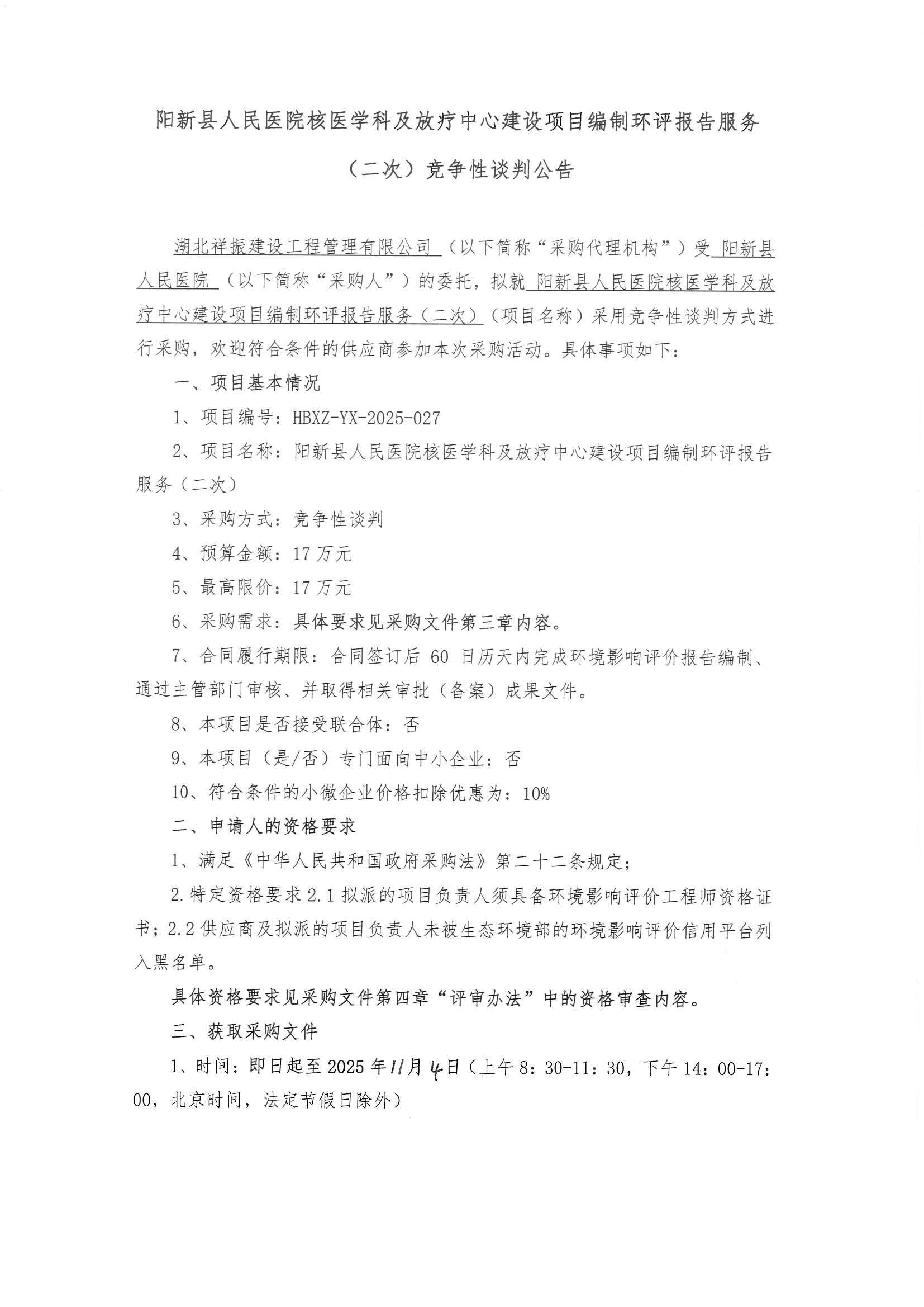 《阳新县人民医院核医学科及放疗中心建设项目编制环评报告服务(二次)竞争性谈判公告》