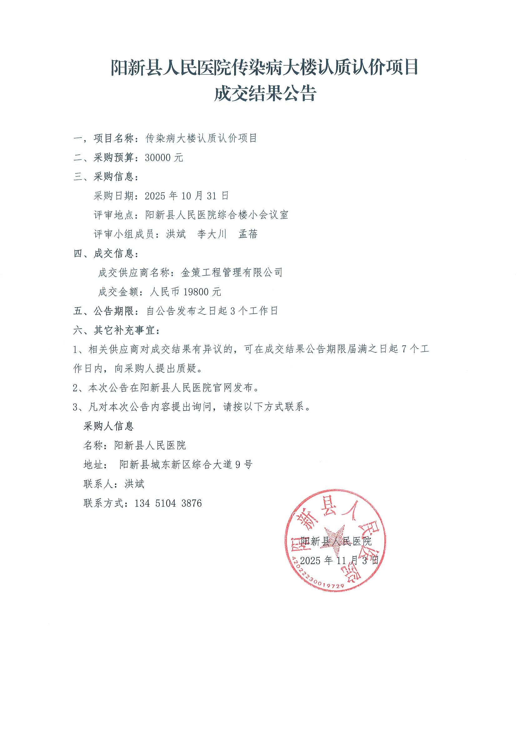 《阳新县人民医院传染病大楼认质认价项目成交结果公告》