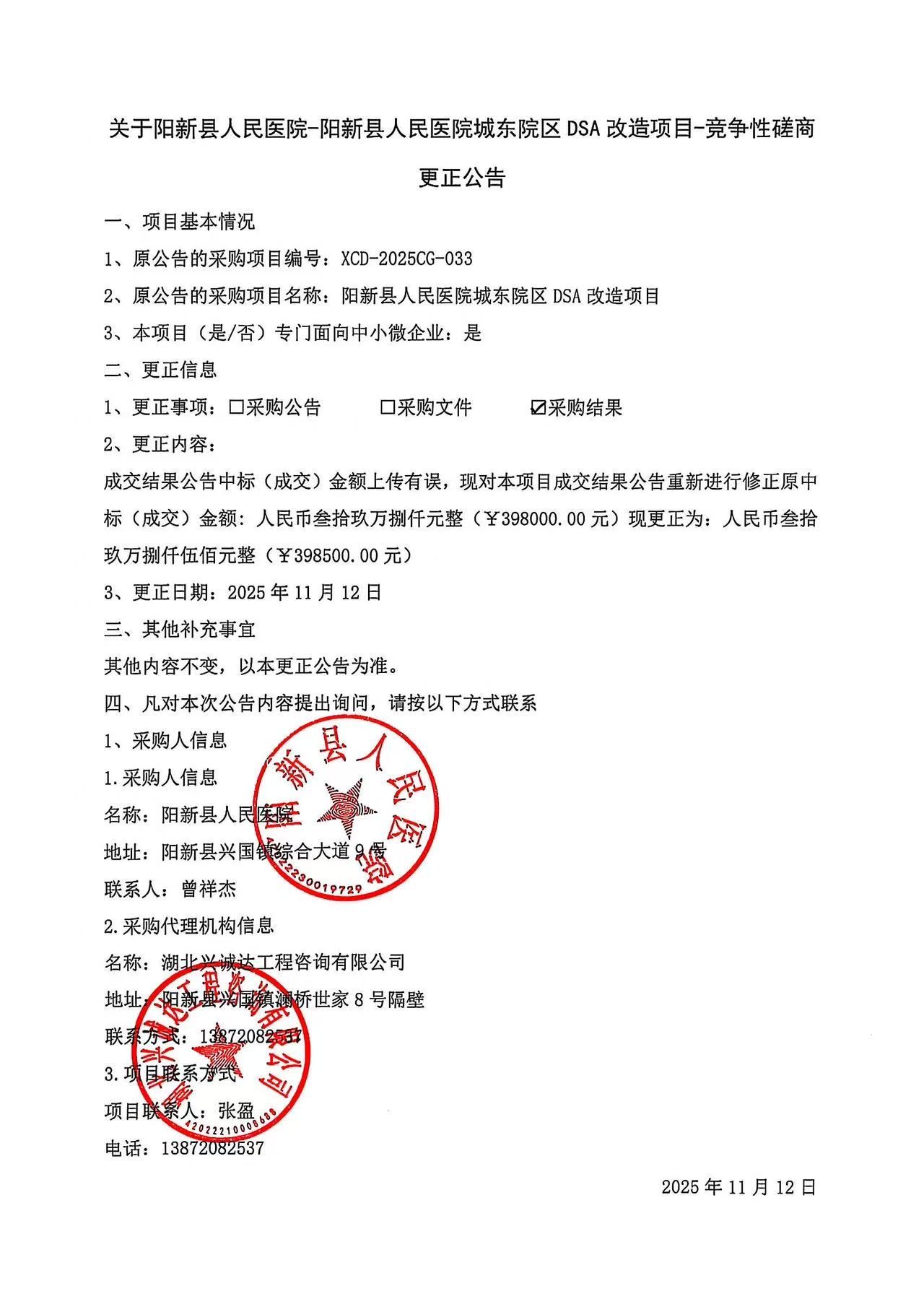 《阳新县人民医院城东院区DSA改造项目竞争性磋商更正公告》