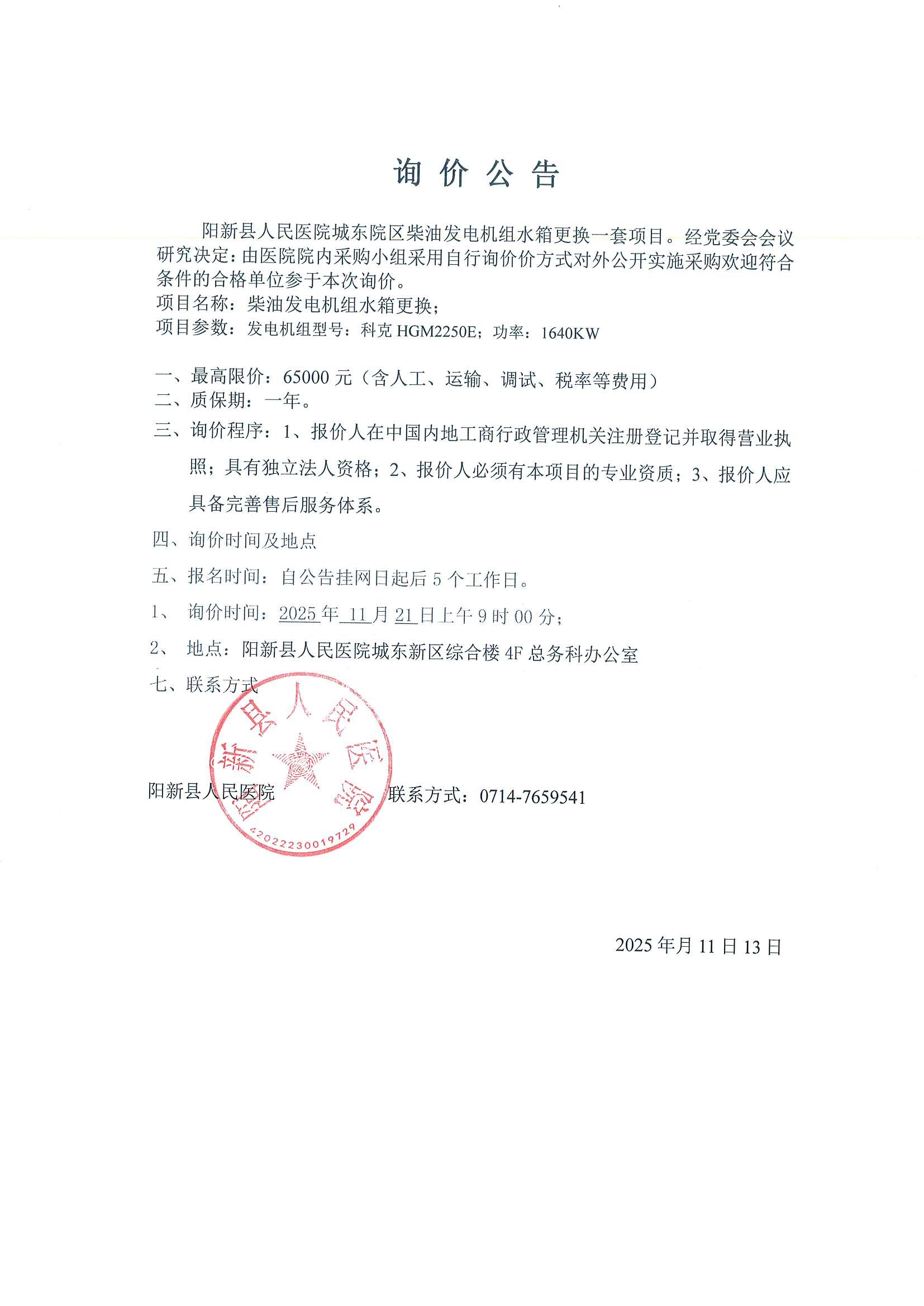 《阳新县人民医院城东院区柴油发电机组水箱询价公告》