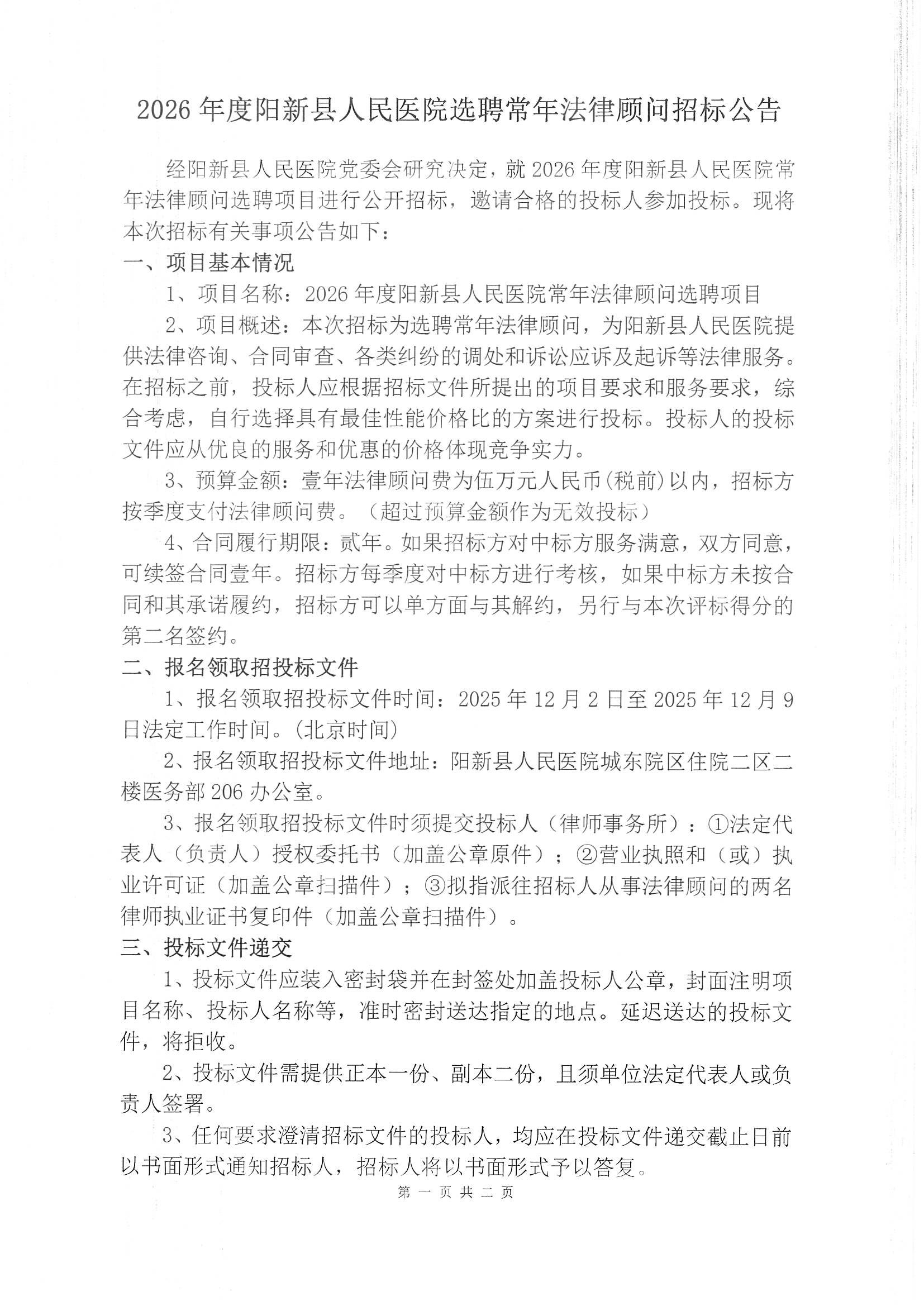 《2026年度阳新县人民医院选聘常年法律顾问招标公告》