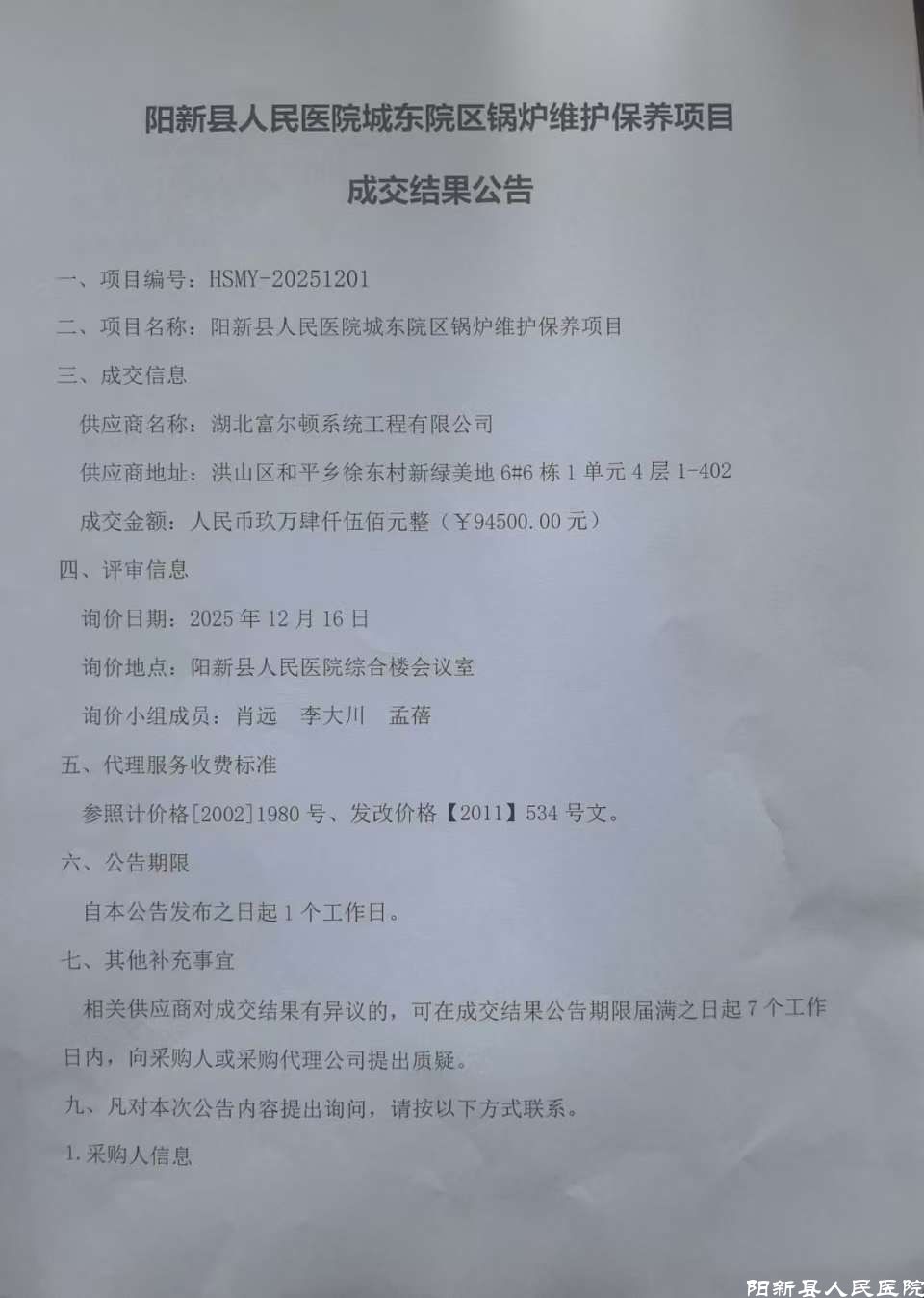 《阳新县人民医院城东院区锅炉维护保养项目成交结果公告》