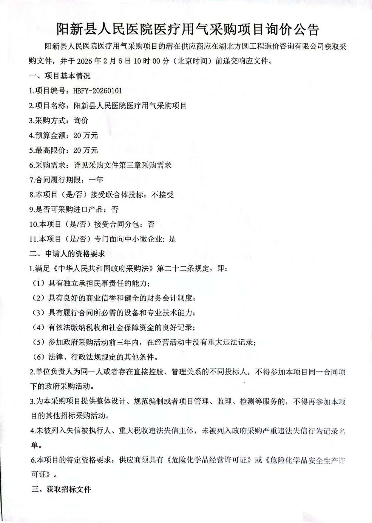 《阳新县人民医院医疗用气采购项目询价公告》