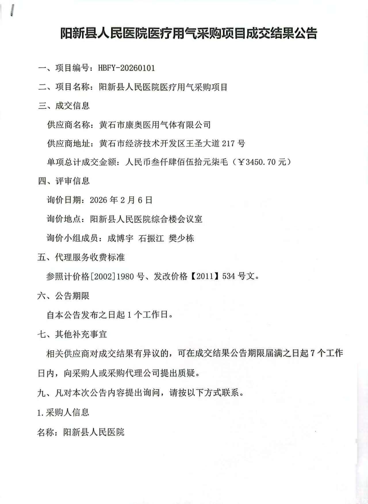 《阳新县人民医院医疗用气采购项目成交结果公告》
